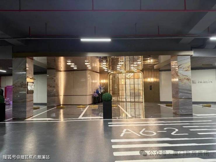 车库入户大堂的柱子用的都是奢石,指引牌用的是金属浮雕。