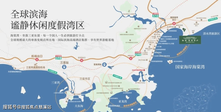 1小时度假生活圈:紧邻G98海南环岛高速,到凤凰国际机场约50公里,距离海棠湾站约10公里,1小时从容国际度假