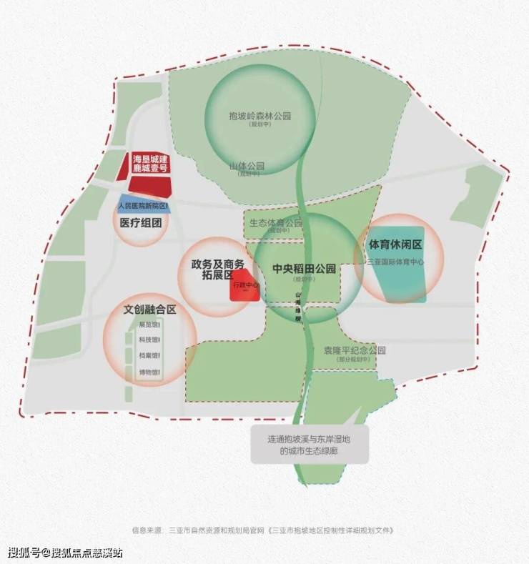 抱坡新城正位于“一心”(大三亚湾中心城区)的主要发展要地,承载着“一心”的总部经济,现代服务业等重要功能,同时既可以联动东翼海棠湾的国际旅游消费,也能对接西翼崖州湾的科技产业集群,是三亚“一心两翼”格局中,产城融合,资源聚合的关键节点。抱坡新城享政府约600亿的重点投资,不仅是三亚面向国际的城市会客厅,更堪称“大三亚”发展的关键引擎之一。(信息来源:三亚市自然资源和规划局官网《三亚市国土空间总体规划(2021-2035年)(公开版)》、《三亚市抱坡地区控制性详细规划文件》、《三亚总部经济及中央商务区规划设计方案》及启动区控制性详细规划公示)