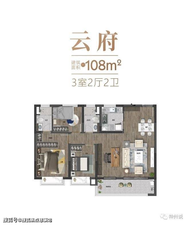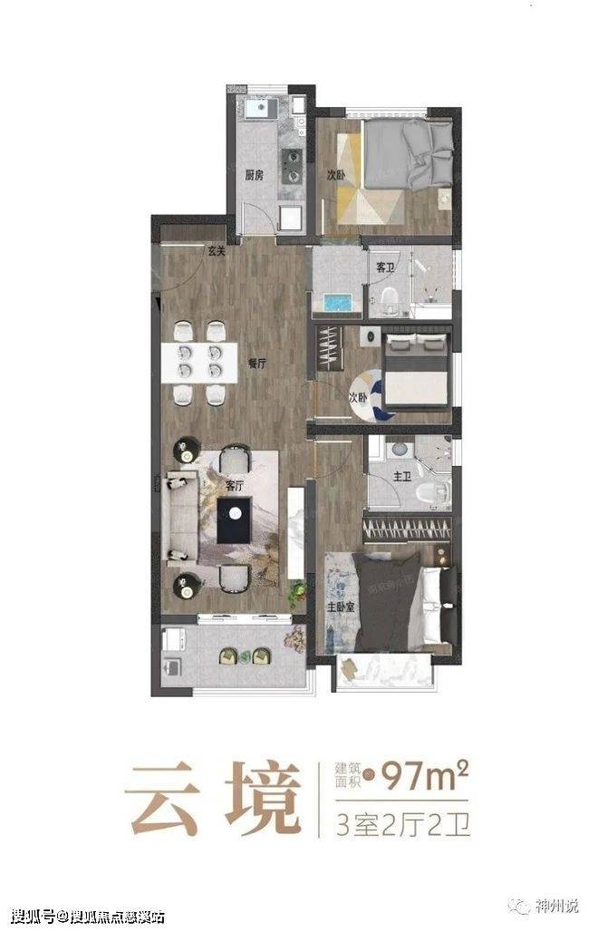 户型为三室二厅一厨二卫设计,主卧套房设计,带衣帽间和独卫,动静分离,会客休息两不误,户型方正,面积利用率高。