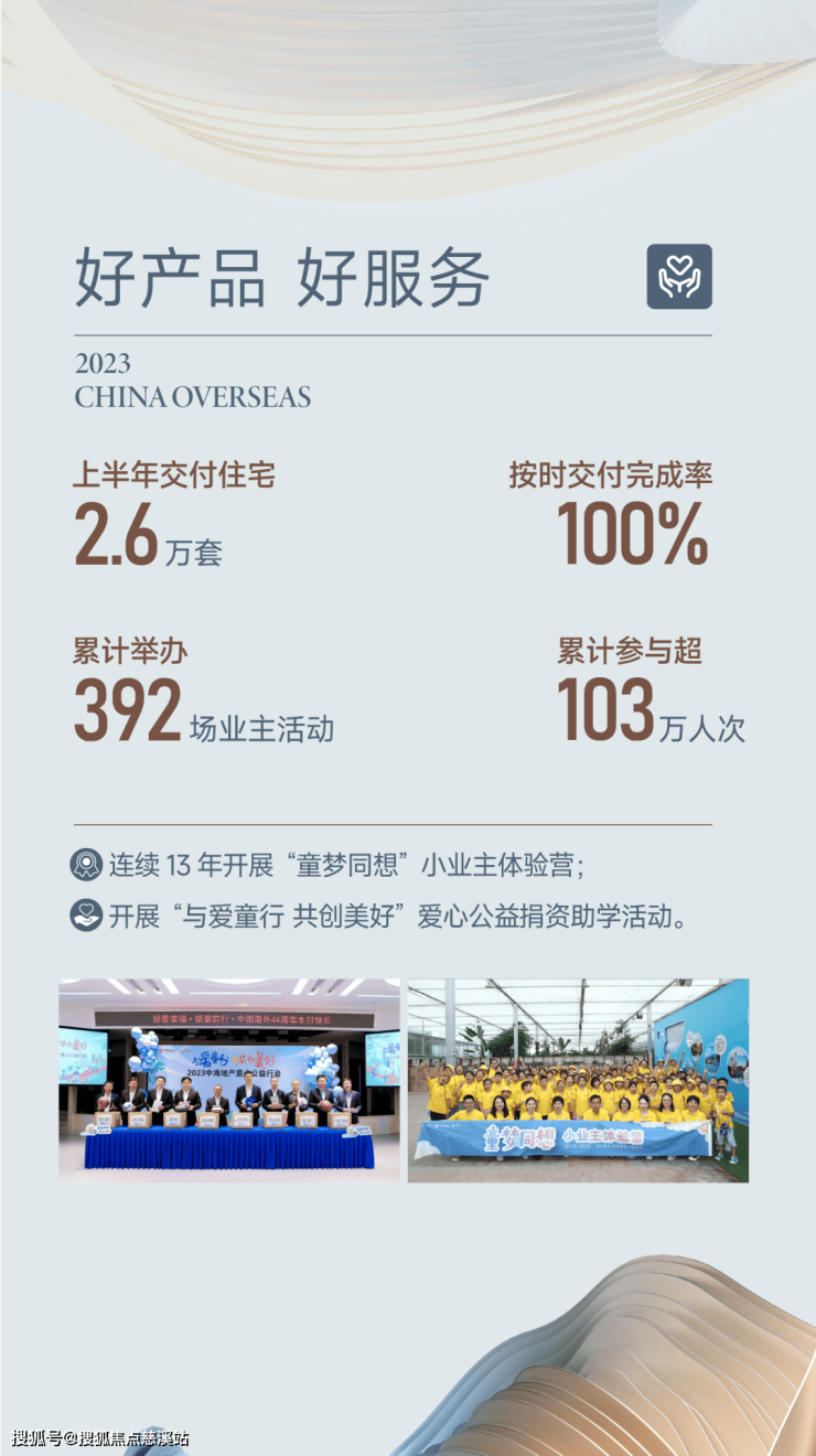 中海品牌—安全保障力:“三道红线”政策出台以来,中海地产始终稳居“绿档”榜,信用评级行业最高。2023年上半年交付住宅2.6万套,按时交付完成率100%。