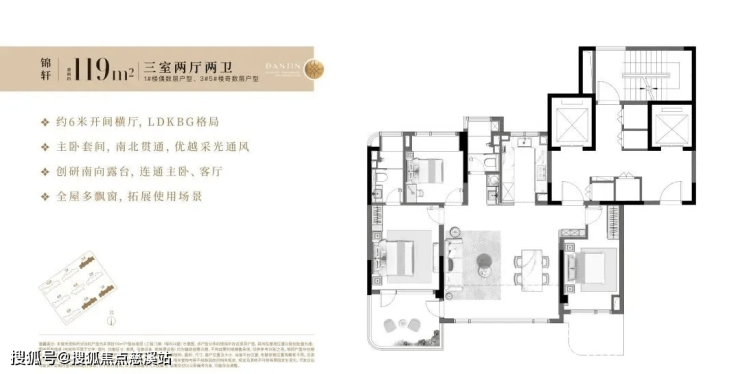 三是三开间朝南,超大窗墙比,配上约6米开间大横厅,整体约33平,开阔度堪比大平层;