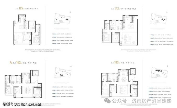 1号楼为总高26层的高层,两梯四户带连廊设计;边户为143㎡三室两厅两卫,南向开间约12.5米,6.2米宽厅,主卧开间3.4米,两个次卧2.9米;中间户为125㎡三室两厅两卫,南向开间约10.3米,客厅开间4米,主卧3.3米,北次卧2.7米左右