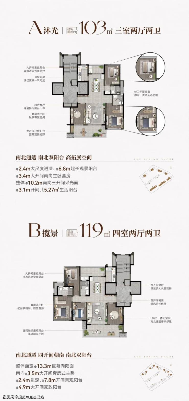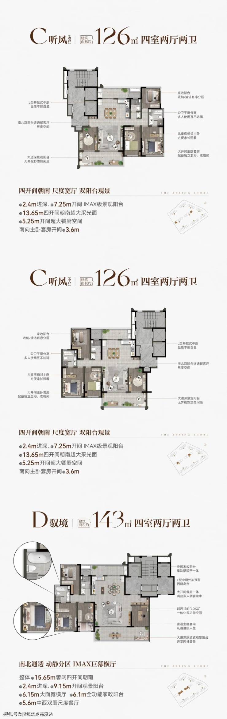项目规划建筑面积约103-143㎡改善户型,层高最高约3.05m,南北通透、双景观阳台、南向多面宽,于一方宽境里,满足对阔绰空间与舒适格局的拥享。