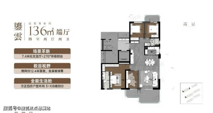 高层:136㎡四房,环幕端厅设计(边户客厅开间 7.3 米),奇偶错层小露台,精装交付