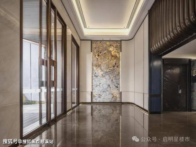 电梯厅则甄选古铜色不锈钢金属电梯门搭配仿皮革木板铺面,以及蓝翡翠岩板的点缀宛若装饰画,将豪宅感武装到电梯厅,业主未来的等电梯时间,不再无聊难捱。