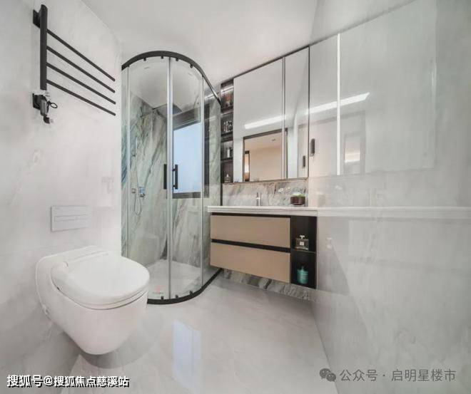 主卧卫浴则精选瑞士劳芬的智能马桶以及德国当代的花洒和龙头,世界顶奢品牌组合,不夸张的说,在装标方面,建发缦云已经next level!(文中涉及品牌,后期或使用同等品牌)