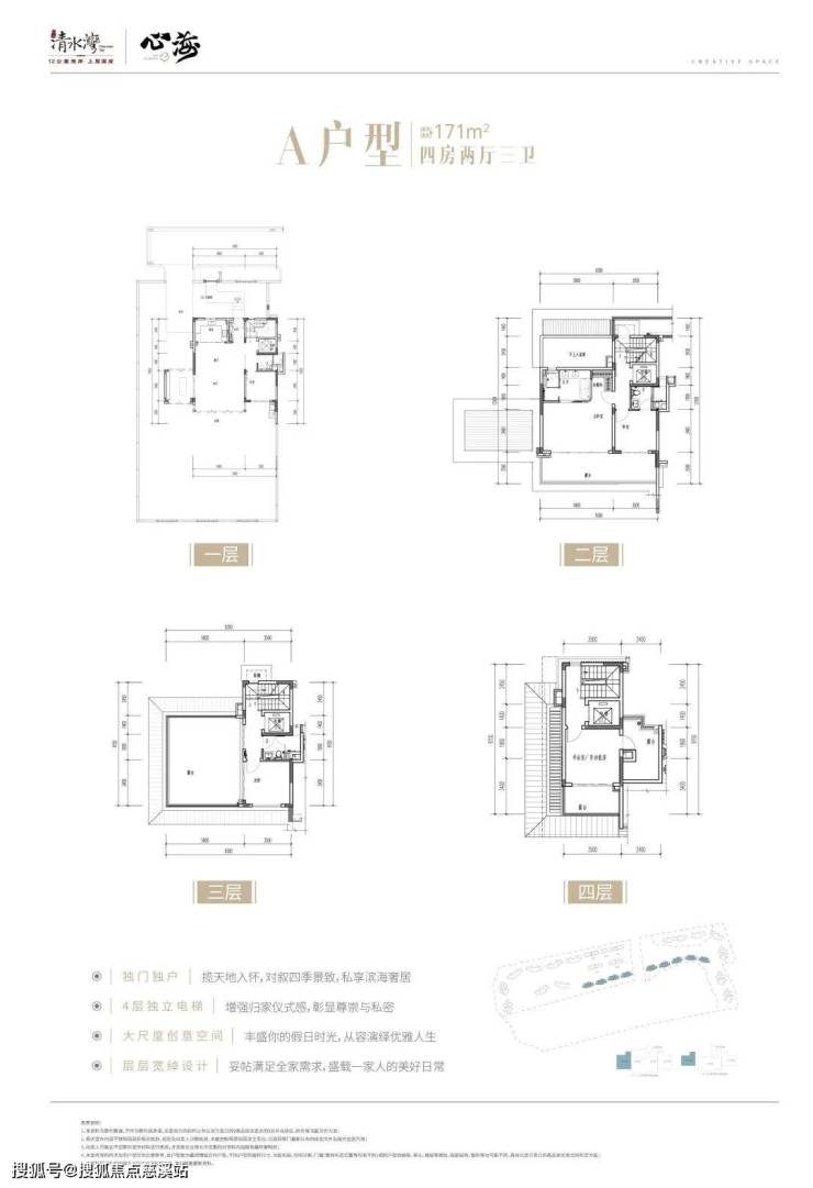 叠拼产品A户型:建筑面积约171㎡,四房两厅三卫