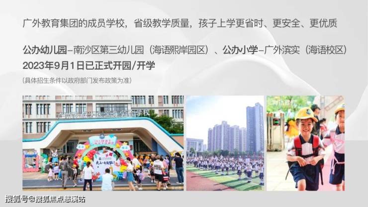 楼下即是顶级名校广州外国语集团旗下滨海实验学校南校区(南北校区、九年制)以及南沙第三幼儿园(海语熙岸园区);