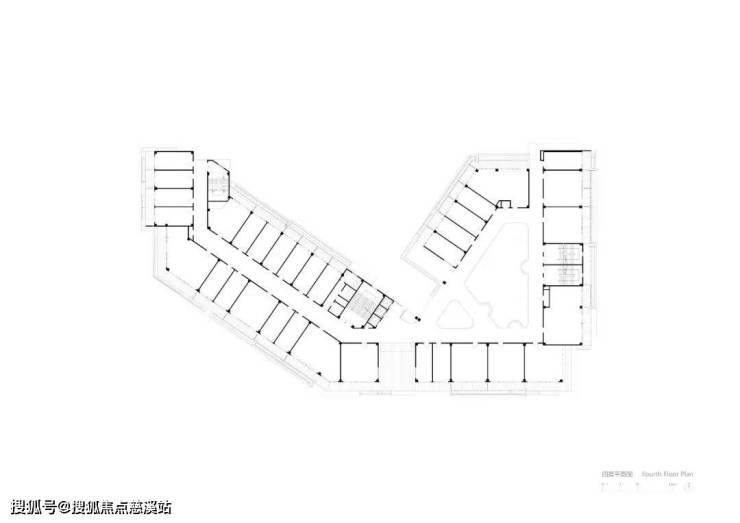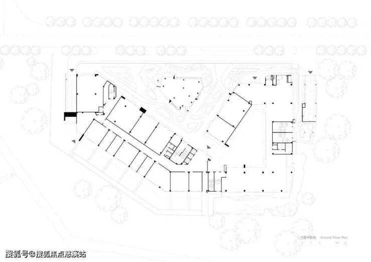 主要面对湿地公园 ?这虽自然,但会忽视北侧的入口关系;若优先营造街道立面,又容易使建筑背对公园,姿态消极。我们试图兼顾两者。我们尝试采用S型的体量,相互缠绕,从而创造两个庭院空间,并形成穿过建筑的通道。西侧的庭院和道路相连,形成类似城市广场的放大节点;东侧的中庭更具探索性,同时向上和向后延伸连接南侧的公园。两个庭院通过部分下沉的空间来连接,不仅提供了宝贵的阴凉,更在公园与街道间构建了一条“洄游”路径。行人可在此自由穿梭,体验探索的乐趣,弥补了新区所缺失的宜人步行感受。
