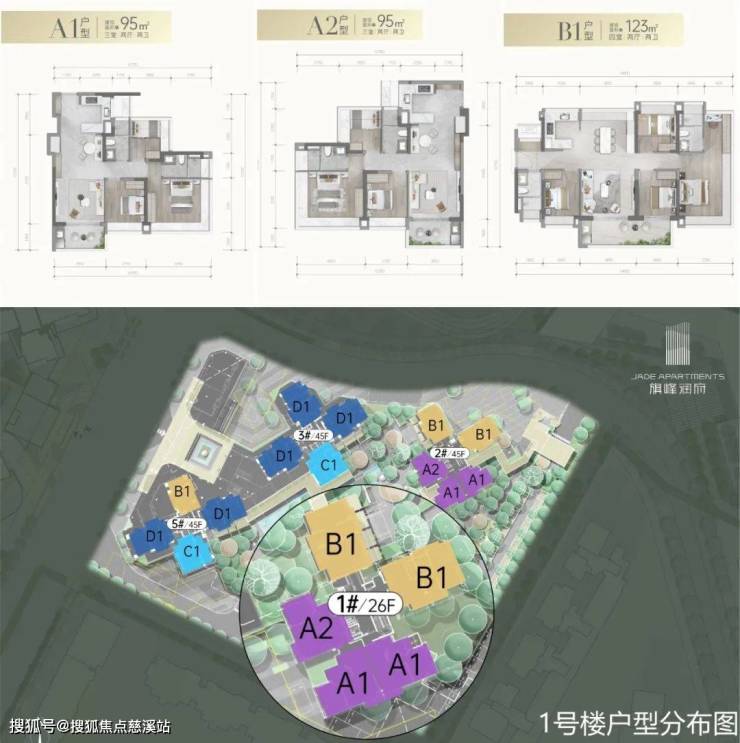 1号楼主要为入门户型,层高26层,3梯5户,建面约95-123㎡的3-4房。