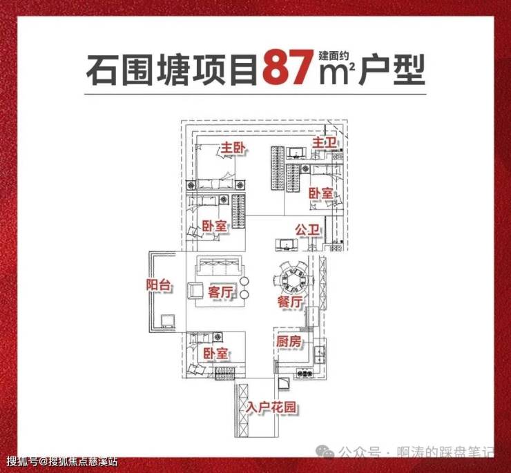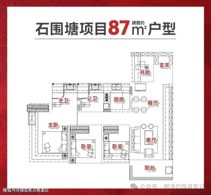 约87㎡则是4房2卫,但两个户型差距较大,其中一个是拥有独立玄关的竖厅。