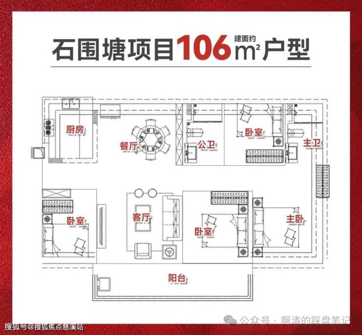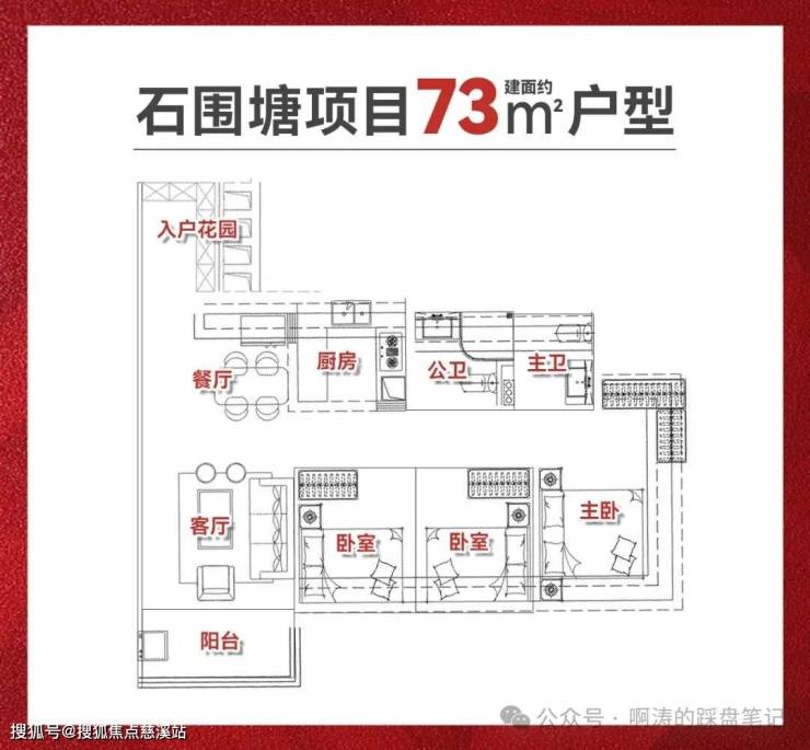 另一个户型则是单边位,做到南北对流;且主卧观景面、采光面更广,是小户型难得的U型采光。