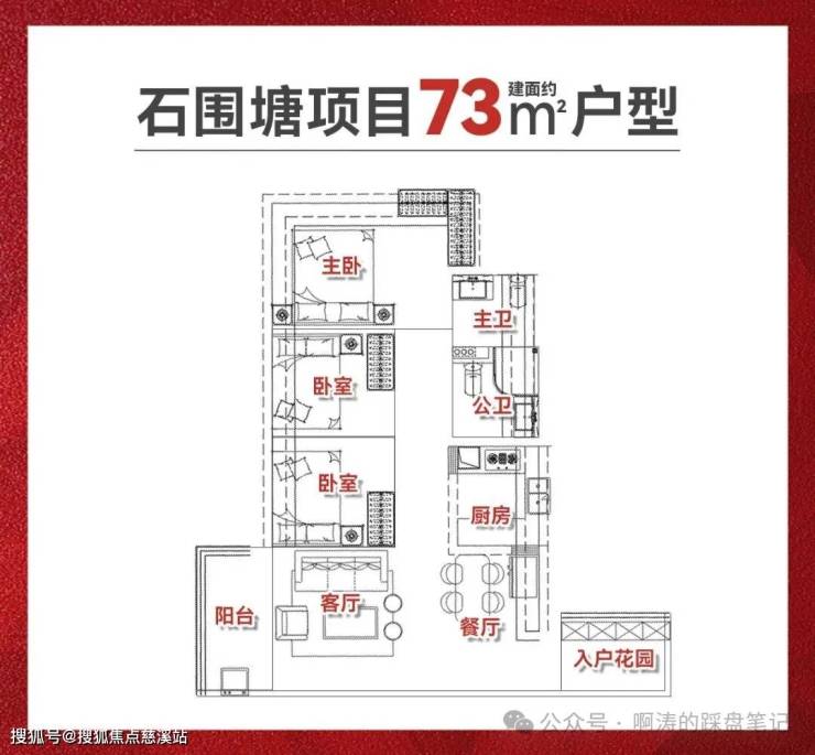约73㎡三房,两个户型相似,主卧可以实现270°观景,还有衣帽间和独立卫生间。不过,独卫面积较紧凑,难做干湿分离。