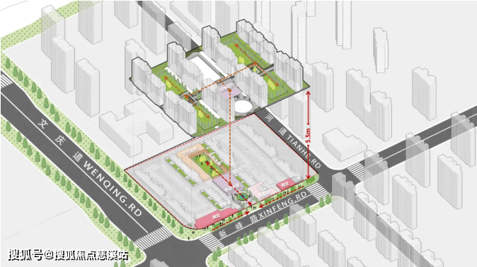 结合规划布局和架空平台进行打造,全架空体系,场地抬升5.5m,平台板按规范比例开洞,效法传统开山理水的造园手法,将仪式礼序融入园林景观,集中设置在地块中央,结合景观设计,形成一条中央绿谷,高架空平台与多层级下沉庭院形成立体街巷,全域绿化,进人尺度体验丰富。
