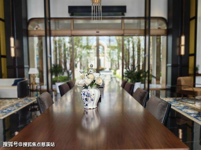 在落客大堂内部,考虑到直通略显空旷,我们在大堂中间的位置设计一个长桌。同时室内布局设计又能跟室外仪仗式景观喷泉形成呼应。两边有近4米的高大的书架,通过私密半镂空的屏风进行分隔,业主约朋友趣谈,我们都能实现即有开放的空间,也有一定的私密性的场地。