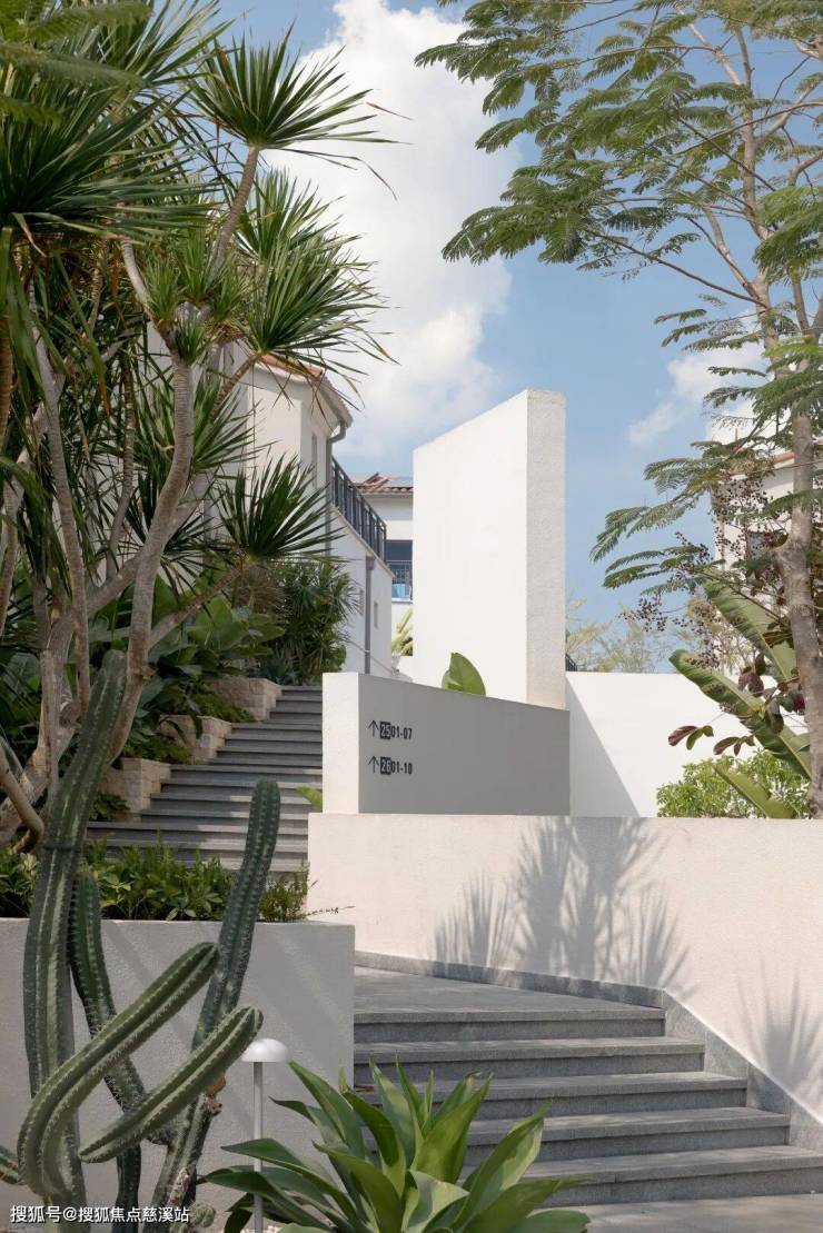 入口处沙生植物组团呼应着象腿树得婆娑,进入巷道,高大的白墙掩映着鹤望兰,春羽等大叶片植物,为三亚的炎热增加一抹清凉。植物从品种、色彩、层次、质地上均精斟细琢,形成一种全新的景观体验。