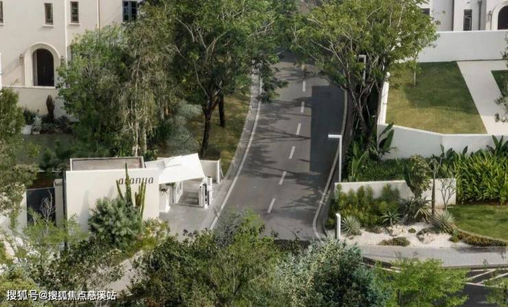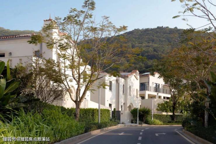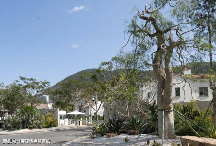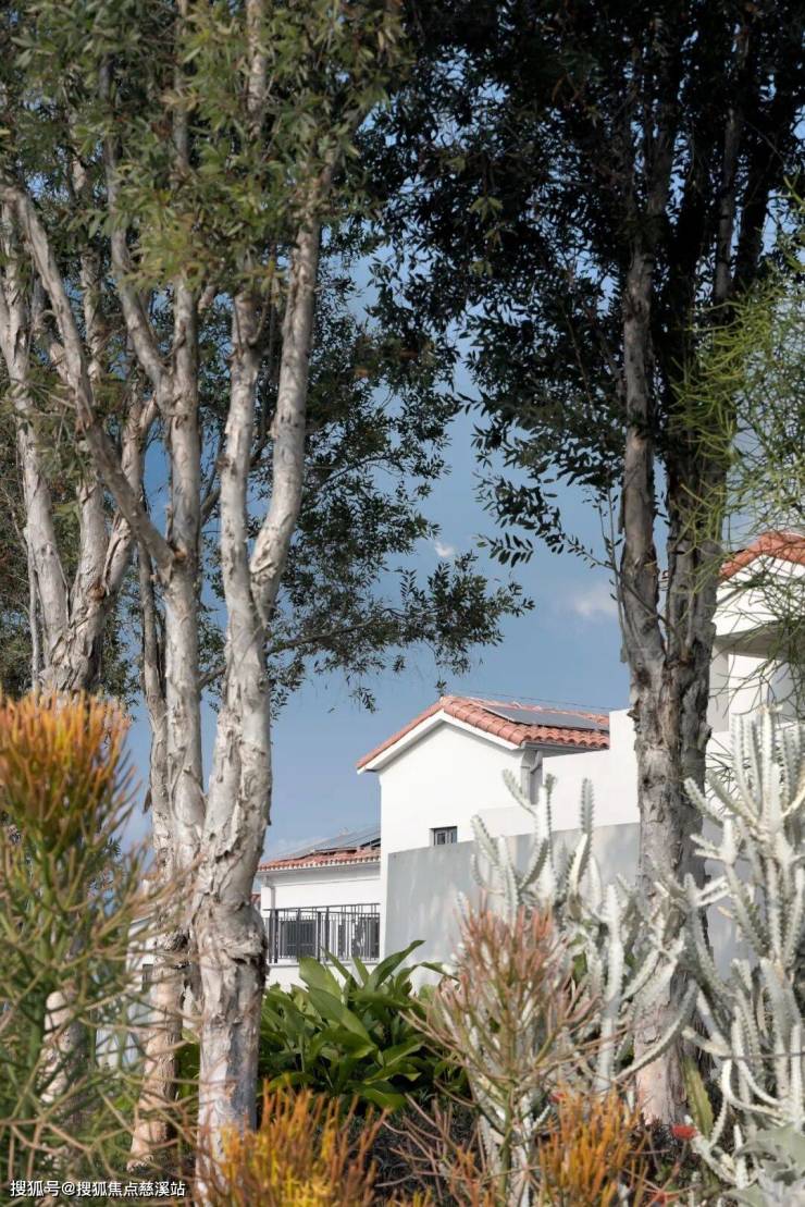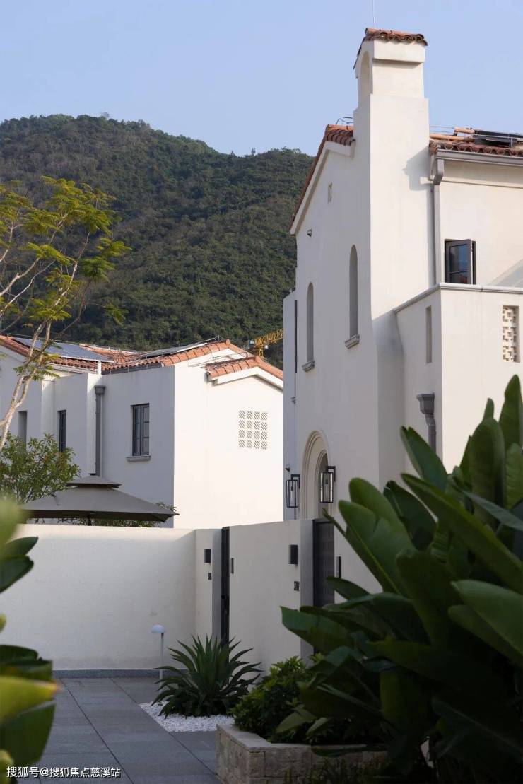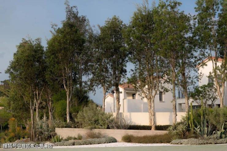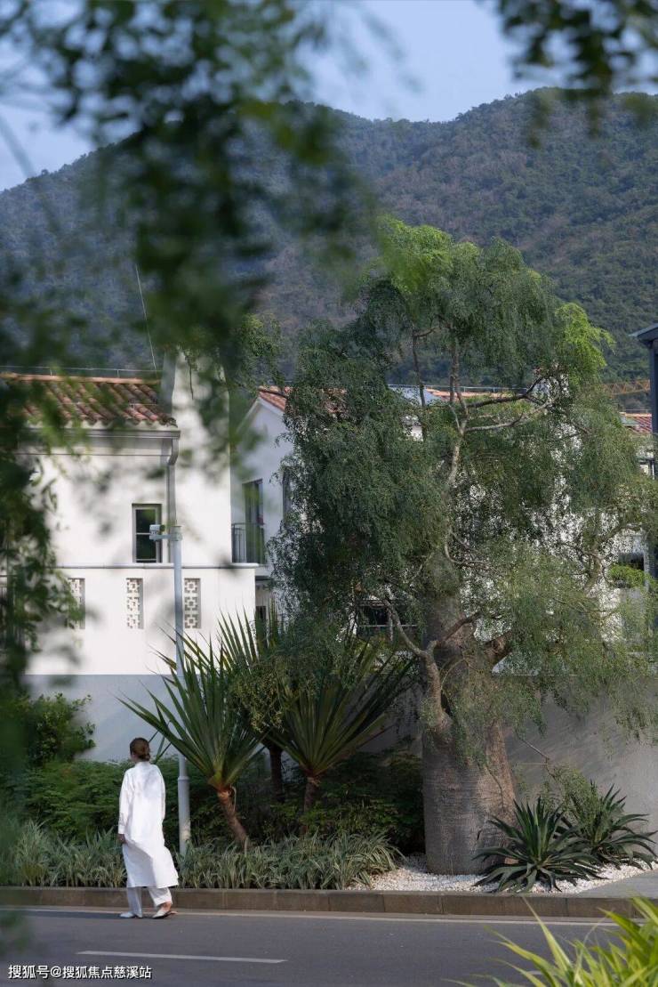 因为是个山谷,它形成了自己独有的清幽舒爽的微环境,比起海边闷热潮湿的环境,体感上要舒适很多。建筑呈环状分布,一条车行道贯穿场地。白墙红顶的地中海式建筑,映衬在澄澈的蓝天之下,烘托出宁静的氛围。