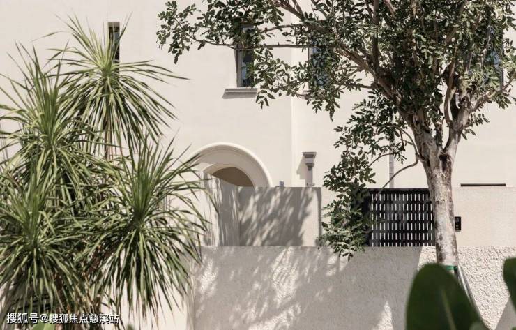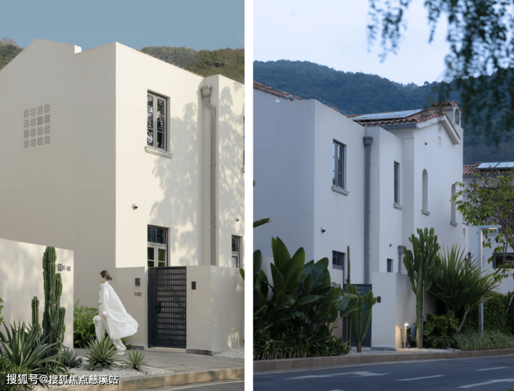 两个入口的设计均采用左右两侧不对称的简约白墙夹合出独立边界,以此进行内外空间的转换。景观尝试寻找与建筑的关系,在层次丰富、形态各异的沙生植物掩映之中,白墙犹如从建筑延伸而来,与白色建筑群相得益彰,融为一体。