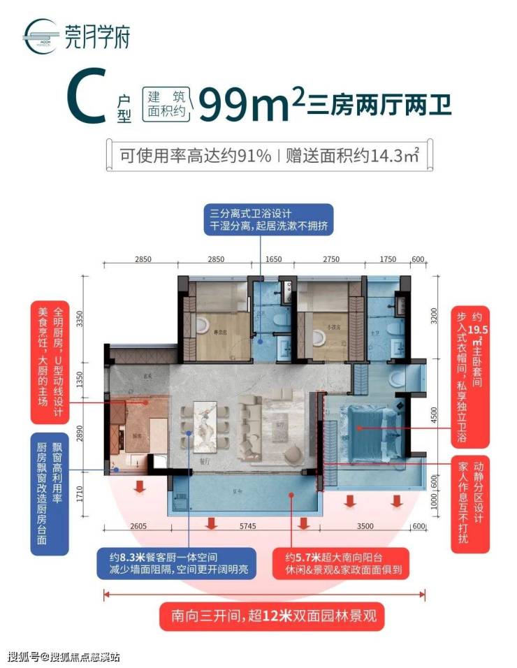 建面约99㎡ 三房两厅两卫,可使用率约91%户型亮点:约8.3米餐客厨一体空间;南向三开间,超12米双面园林景观👇