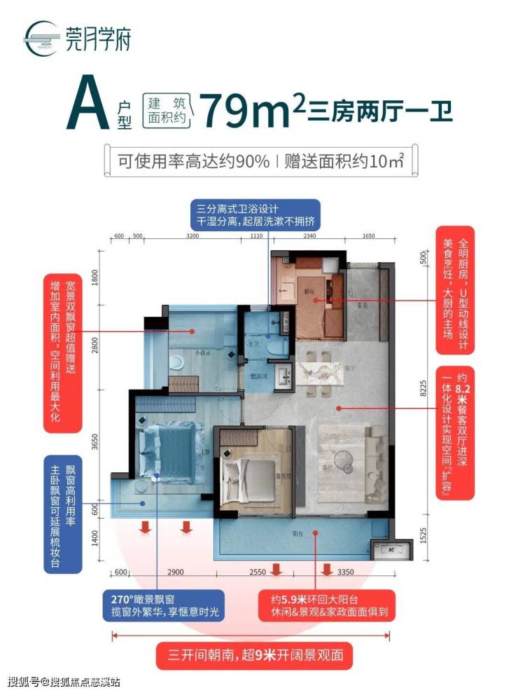 建面约79㎡ 三房两厅一卫,可使用率约90%户型亮点:约5.9米环回大阳台;三开间朝南,超9米开阔景观面👇