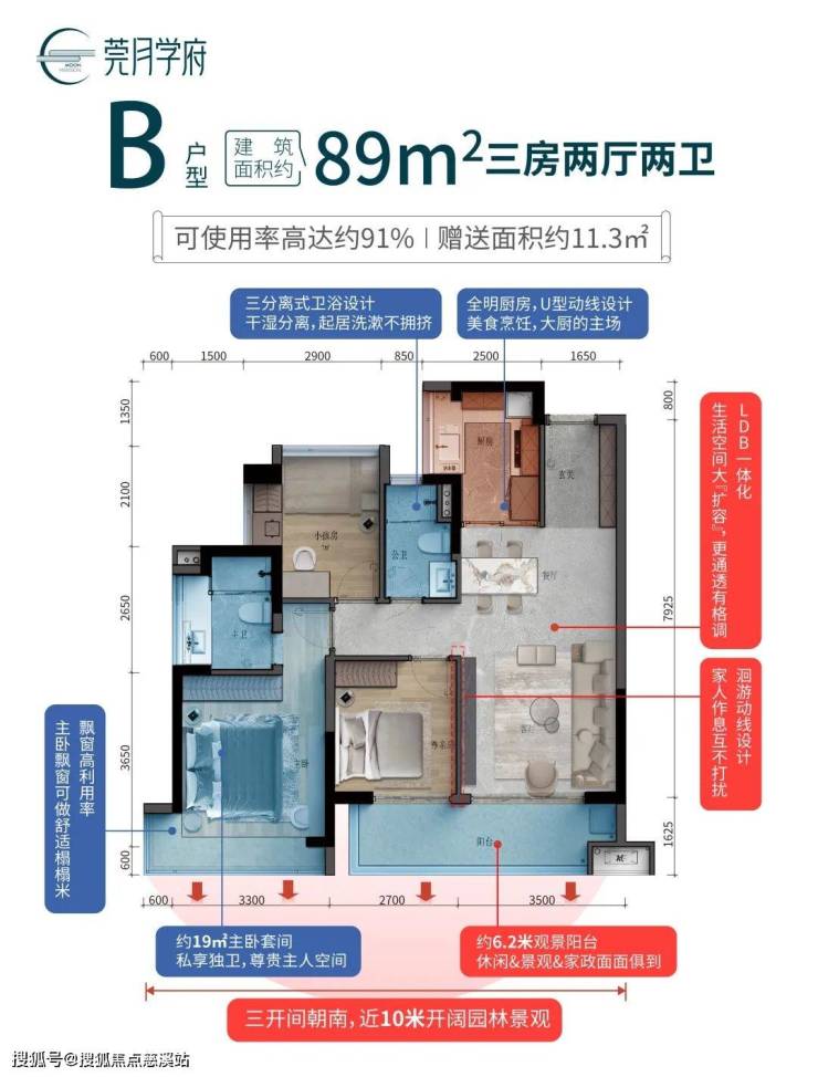 建面约89㎡ 三房两厅两卫,可使用率约91%户型亮点:约6.2米观景阳台;三开间朝南,近10米开阔园林景观👇