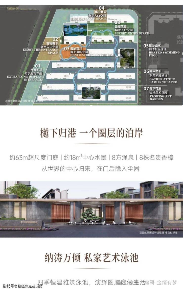6重归家礼序约2.7万方低密园林,约63米超级主大门18方中心水景,小区设计:无风雨归家/下沉式庭院/星级酒店式地下车马厅/四季恒温泳池/泛会所私宴会客厅等。