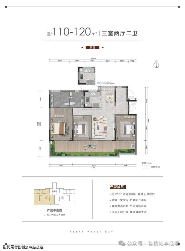 建面 110 - 120㎡花园洋房,主力户型三室两厅两卫,堪称空间美学典范。百分百得房率,电梯专属入户,尊崇私密。四开间朝南,约 12.75 米阔景阳台将海天一色、园林葱郁尽收眼底,餐客一体阳台设计,清风暖阳常伴,干湿分离卫浴,生活清爽有序,售价 300 - 430 万间,27 号楼顶层露台可观海,揽星辰入怀。