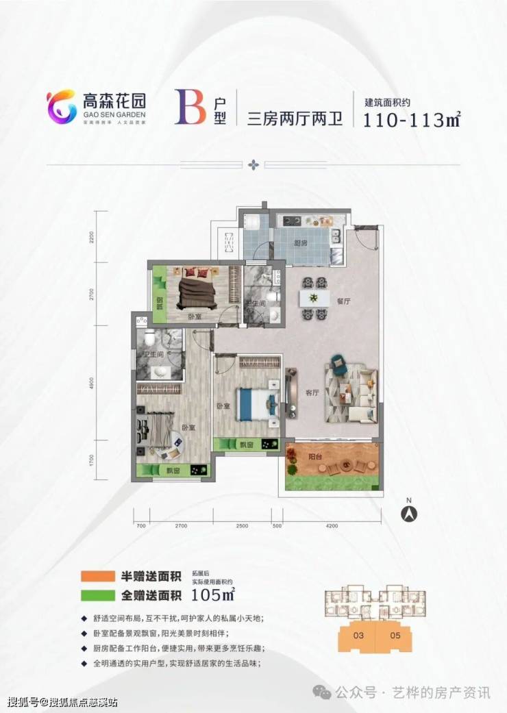 • 项目分南、北两个地块开发,北区为3栋楼,南区2栋,均为70年住宅产品,户型为110-132㎡舒适型大三房产品,拓展后实际得房率约最高可达97%。