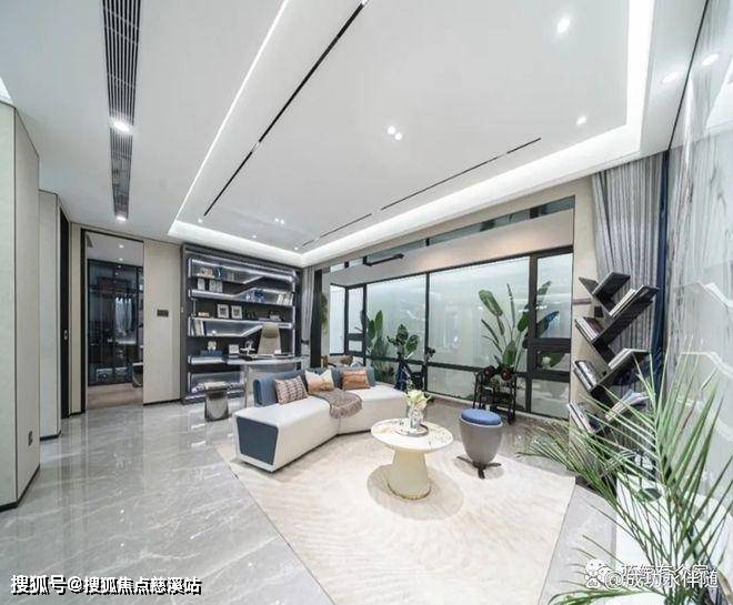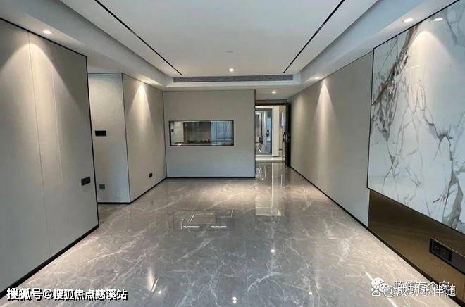 在此基础上,升级装修标准之中,墙面创新性地使用了竹纤维一体板,米白色色调简约大气,有皮面质感;搭配上岩板+长虹玻璃电视背景墙仿皮硬包沙发背景墙金属踢脚线,整体色调柔和统一,视野开阔感完全不像是105㎡户型,起码有着市面上130㎡以上户型才有的空间尺度!