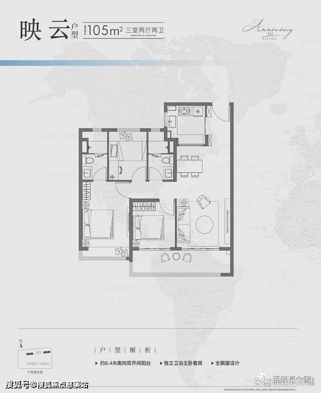 105㎡户型三房设计,三开间朝南、拥有双卫、双阳台,且能飘尽飘。能做飘窗台的地方,都做了飘窗台,包括房间和卫生间,而且都是全飘窗,空间利用率更高。