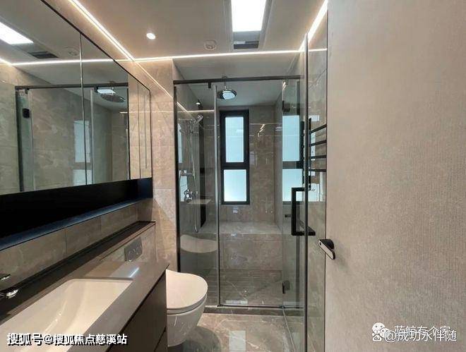 主卧大套间,带有衣帽间和独立主卫,近乎全面屏的飘窗和大玻璃,甚至能在衣物收纳空间和双人床中间,再安排一张化妆桌,豪宅的阔绰感彻底出来了。
