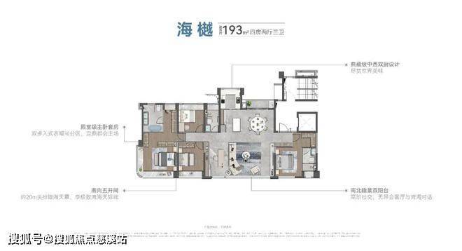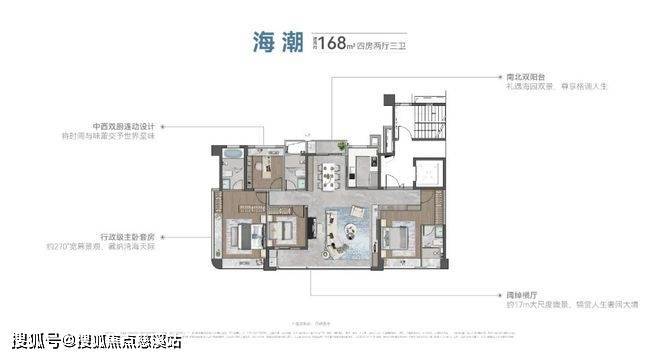 建筑面积约168㎡则超越大部分同级户型,实现了主卧双面瞰景、超72m中庭视距和74m瞰海景观面的三重优势。
