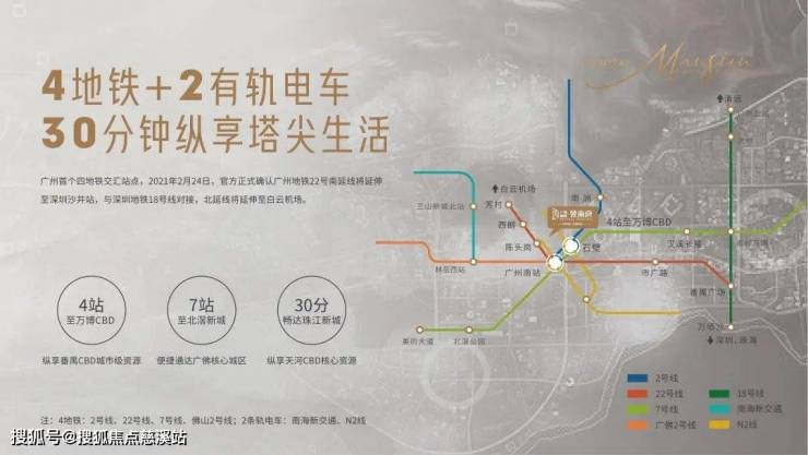 4地铁:2号线、22号线、7号线、佛山2号线。4站至万博CBD、7站至北滘新城、30分钟至珠江新城。