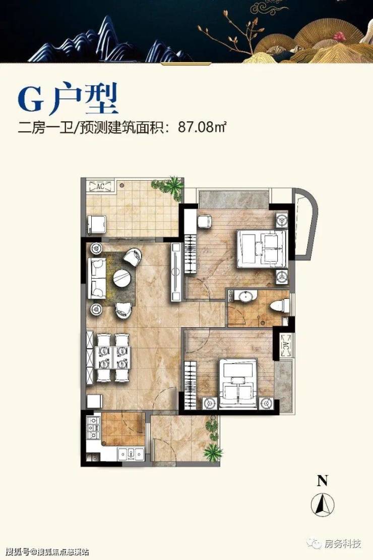 G户型 两房一厅一卫 建筑面积为87.08㎡