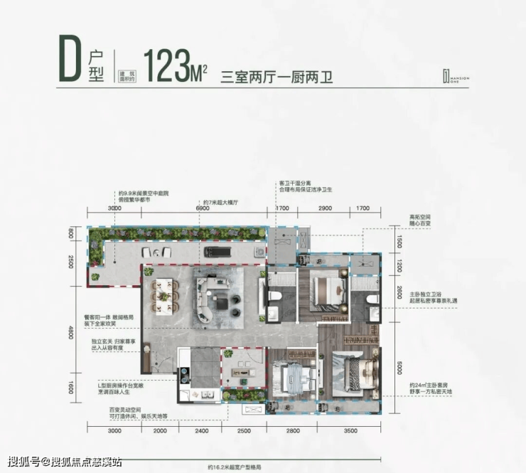 园林景观:以“山海园林”为设计理念,打造中央景观带、全龄架空层、下沉式水苑等休闲空间,营造酒店式归家体验。