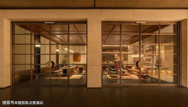 室内空间宽敞明亮,大面积落地窗将庭院内潺潺流水、挺拔的乌桕枝干尽收眼底。在此休憩,无论身处哪个角落,向外望去,皆是如画般的美景。