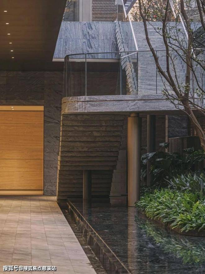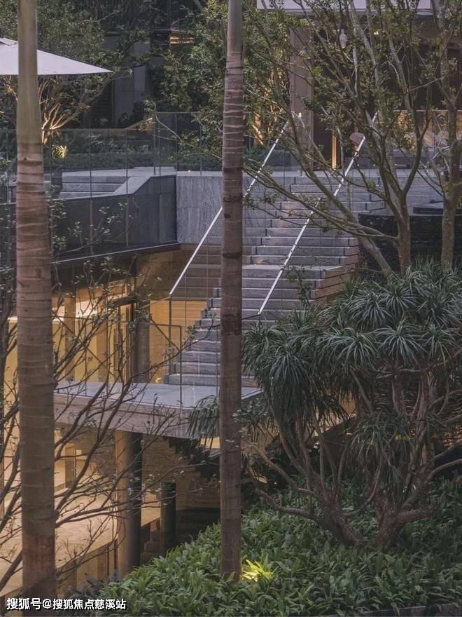 潺潺流水与叠瀑的激流带着一丝远离尘世的浪漫野性。人行动线路经过颐波叠翠,可以通过轻盈的玻璃楼梯到达景观的核心度假空间。楼梯以浅色色系与浓郁度假空间相连,并在材料处理上尽可能轻盈。