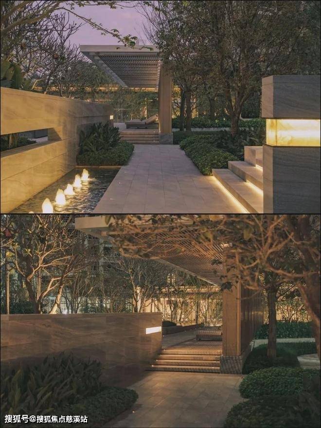 礼遇方面,采用了超尺度的城市界面作为社区的第一道形象。主入口的设计灵感来源于高端度假酒店式大门,简洁大气、纯粹雅致的线条将城市的繁忙与喧嚣隔绝在外,为居民打造了一种尊贵的归家体验,开启了这场度假之旅的魅力序章。