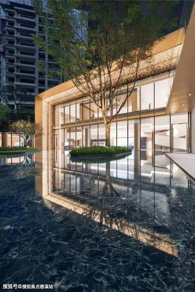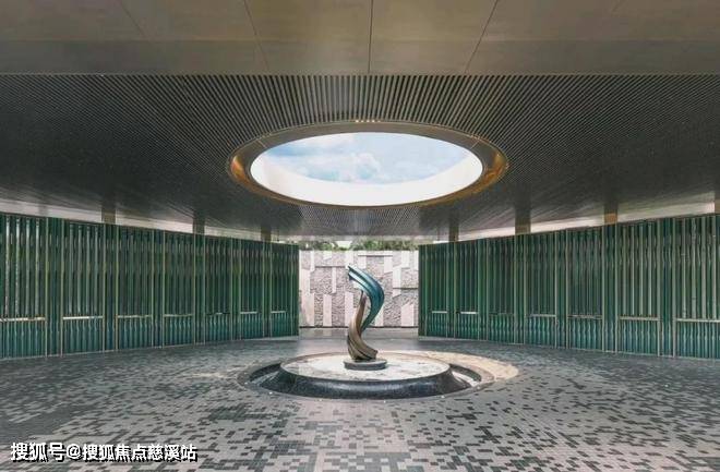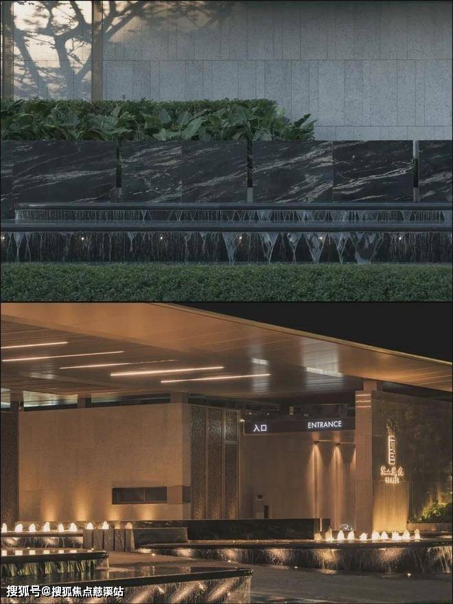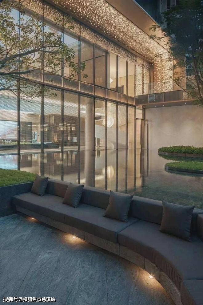酒店环绕式的落客入口与城市界面体系相统一,兼顾了美学和流线组织的需求。车行入口隐藏在高墙大院之后,营造出一种宁静的氛围。迎宾的水景透过水景可以看到第二界面——社区大堂的会客厅,即静心水院。