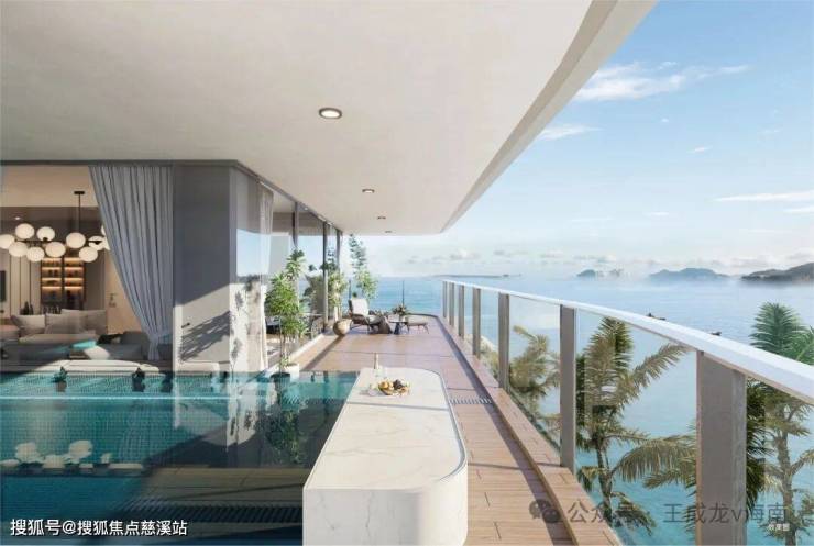 超流体建筑立面呼应海浪肌理,底层架空、悬挑阳台消解建筑与水岸的边界,270°观景阳台、环形瞰海露台设计,让河景、海景与生活空间深度交融,实现“收藏半条海棠河的晨昏”的沉浸式体验。