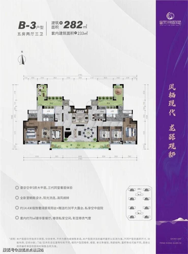 B-3 | 282㎡ | 5+2+3 | 14.4m跑道阳台+30㎡露台 | 70㎡客餐厅、三代同堂旗舰