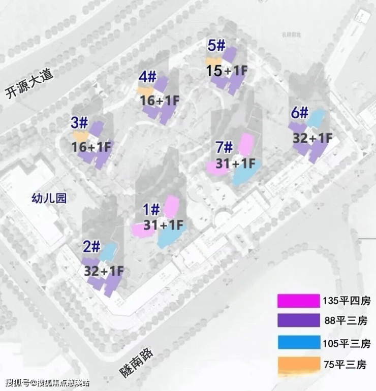 整个项目7栋商品住宅,前排4栋32-33层,后排3栋16-17层,3-4-5-6栋为2梯5户,1-7两栋楼王,2梯4户。