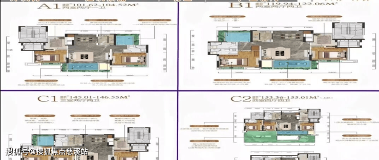本项目除12号楼是一个单元以外,1~11号楼均为两个单元楼栋单元平层内为一梯两户,主力户型为建筑面积106~104平方米的两室两厅一卫,建筑面积119~122平方米的两室两厅两卫,建筑面积145~146平方米的三房两厅两卫,以及建筑面积153~155平方米的四房四厅四卫的上跃户型。