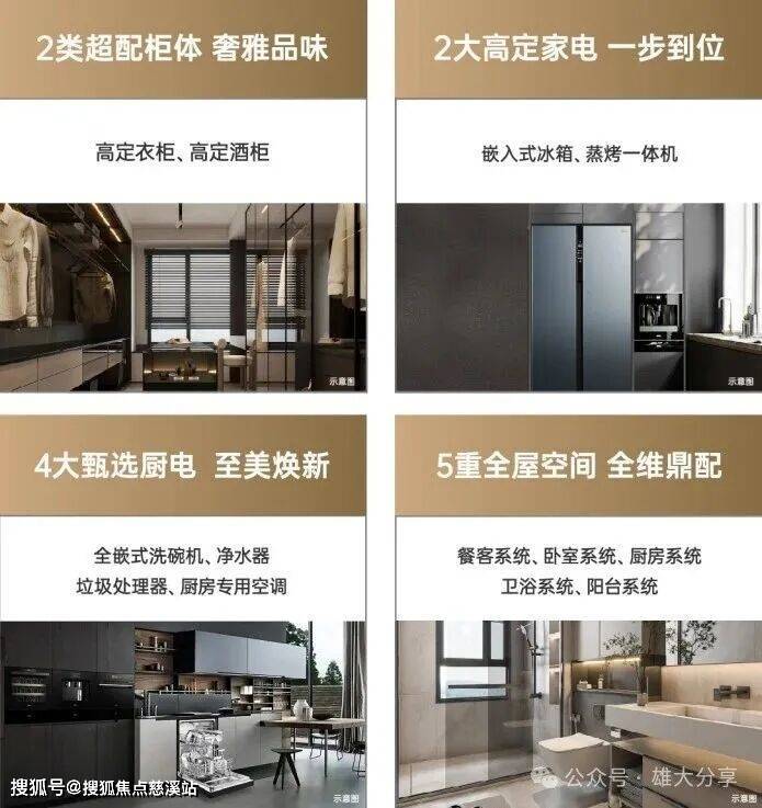 [高标奢装 全系超越]甄选国际精装品牌,威法高定(衣柜、橱柜)、博世(蒸烤箱、洗碗机、嵌入式冰箱)、瑞士恩仕NOVIA浴缸、汉斯格雅恒温淋浴系统、德国唯宝面盆、华为全屋智能系统,以及ALUK阿鲁克系统门窗、加厚式LOW-E中空玻璃等,以“市场升维”的态度,敬畏、引领、创新。