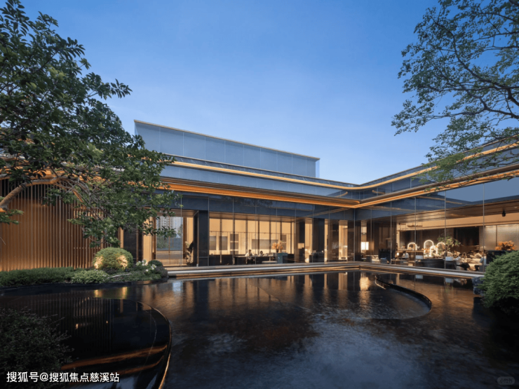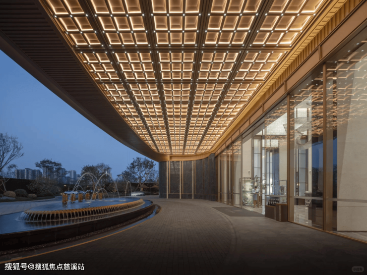 项目中庭特设下沉式悬浮会客厅,环抱三面水景,水波荡漾之外,延绵的连廊优雅展开。采用金属格栅屋顶,营造出半封闭式空间,既保证了隐私的舒适度,又让全景尽收眼底,彰显非凡品味。