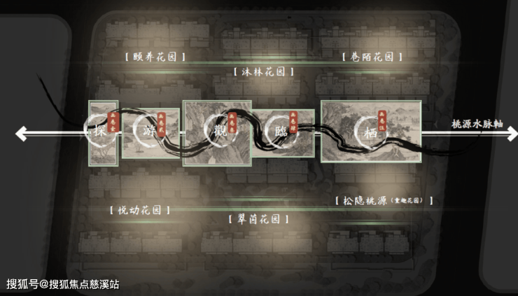 礼序中轴,东西延展,奠定社区空间骨架与仪式格局。它不仅是串联“五进”桃源秘境之旅的主脉络,更巧妙融合传统礼制精神与《桃源问津图》的隐逸意境,于严谨秩序中流淌自然野趣,成为承载归家礼序与桃源栖居理想的核心景观轴线。