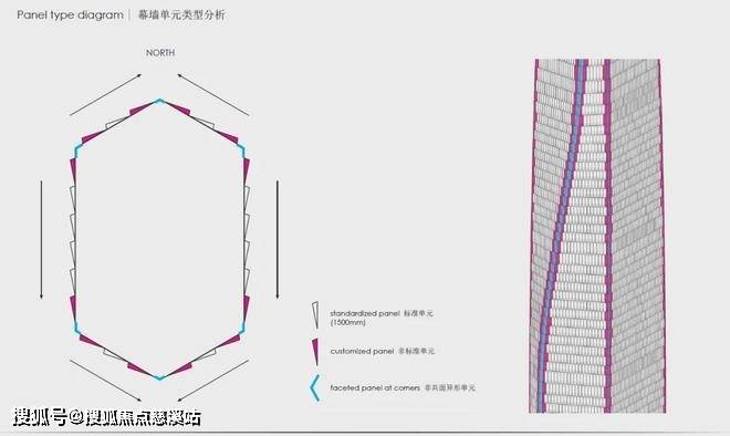 在“海之韵”的设计立意下,旋转扭动的塔楼形体必然比一般的标准层塔楼要来的复杂。在设计过程中对幕墙单元进行理性简化,主塔的塔体我们有9000多个单元,最后基本分为四类 (参见示意图):