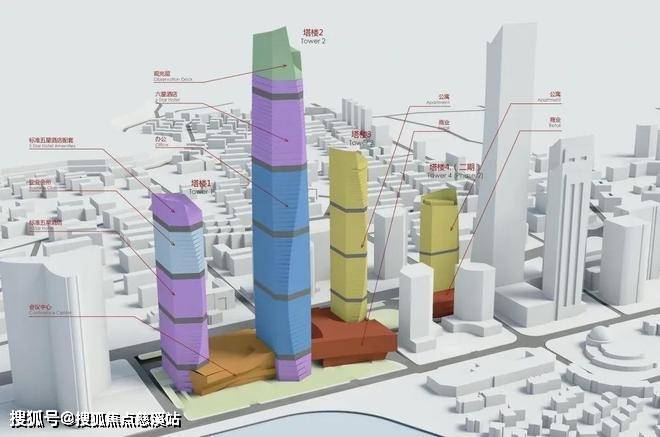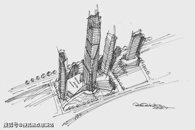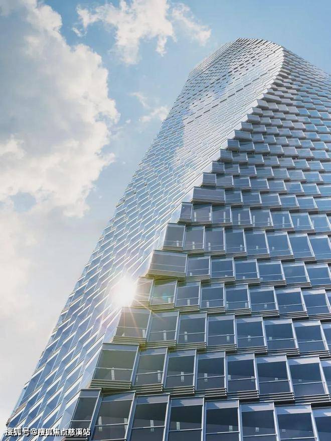 承袭之下,更有创新,三栋塔楼逐层南北端点渐次摆动旋转,连成六条海浪般的曲线,形成与大海波浪相呼应的充满张力和波动的形体,三塔自上而下不同波长将大海韵律淋漓展现,塔一和塔三的 “小浪”与主塔的“大浪”相互错动,沧浪三涌;三座塔楼为城市天际线画下优美轮廓,如浪涛起伏,生生不息。