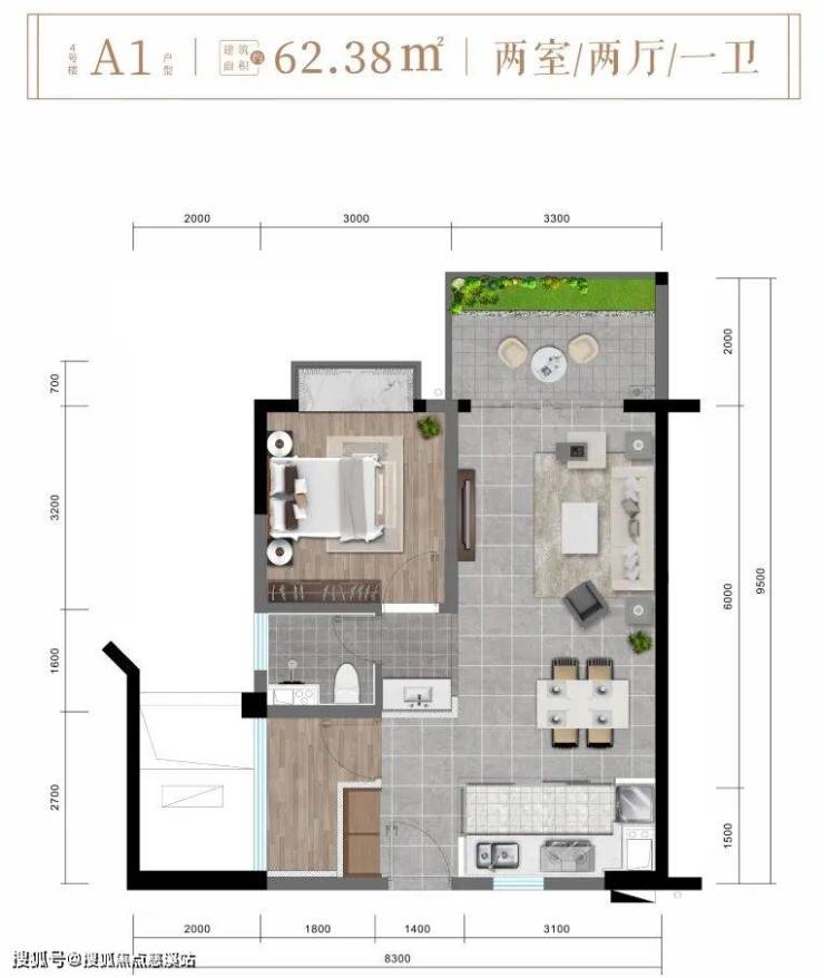 ✨4楼 A1户型约62㎡精致两房两厅一卫